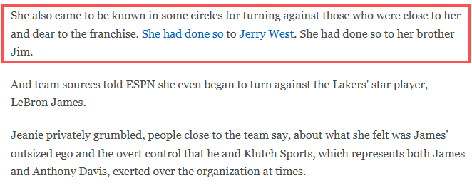 实际上负面意味浓郁,站在现实世界而非报道角度,珍妮与詹姆斯是一荣俱荣一损俱损的利益共同体。詹姆斯为湖人,为珍妮执政时期的湖人带来冠军,而珍妮给予的回报是年年顶薪外加队内特权。